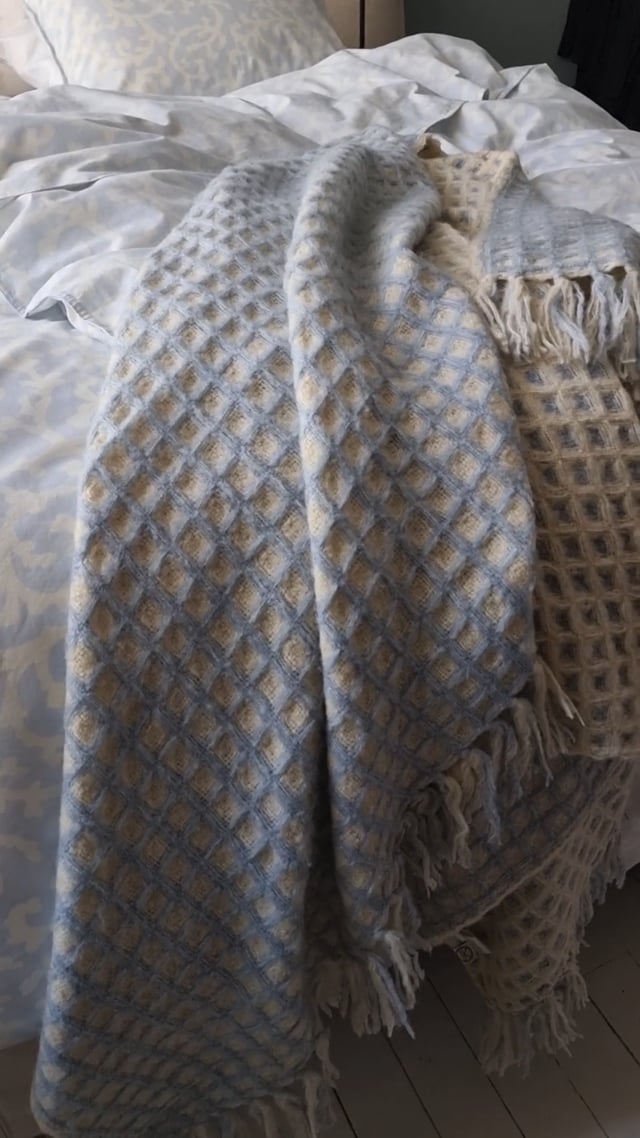 En av vårens nyheter er Clemence – et varmt og romslig pledd i ullblanding. Det unike rutemønsteret skaper en vakker dybde og tekstur som virkelig kommer til sin rett. Designet er laget i myke, harmoniske farger som gir et tidløst uttrykk, og pleddet fås i både delikat blå og klassisk beige. Clemence er like fint i sofaen som på sengen og tilfører en subtil tekstur og fargetone til rommet. Ullen holder godt på varmen, samtidig som pleddet føles lett og behagelig over kroppen. Den fine frynsekanten gir en ekstra detalj som fullfører den elegante looken.
